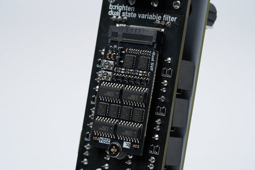 Custom modified MS-20 filter core features simultaneous two-pole low-pass & band-pass, and a single-pole high-pass output.